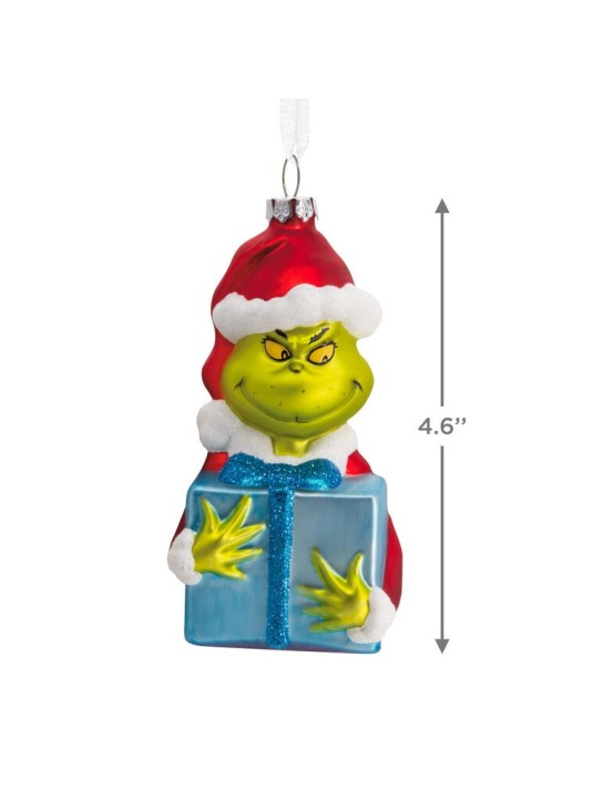 Celebrate the family tradition of the Dr. Seuss classic “How the Grinch Stole Christmas!” This blown glass Christmas tree ornament features the Grinch in his homemade Santa disguise with a scheming expression, holding a blue present. The decoration is a fun addition to your tree that will delight all the Whos in your home, the tall and the small.
