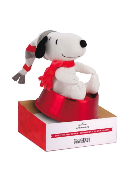Let Snoopy bring holiday happiness to your home with this Christmas tree topper. The charming design features Charlie Brown's beloved beagle ready for a wintertime sledding adventure as he sits in an oversized dog dish wearing a festive hat and scarf. Perch the plush decoration on the top of a full-size Peanuts-themed tree for some family fun.