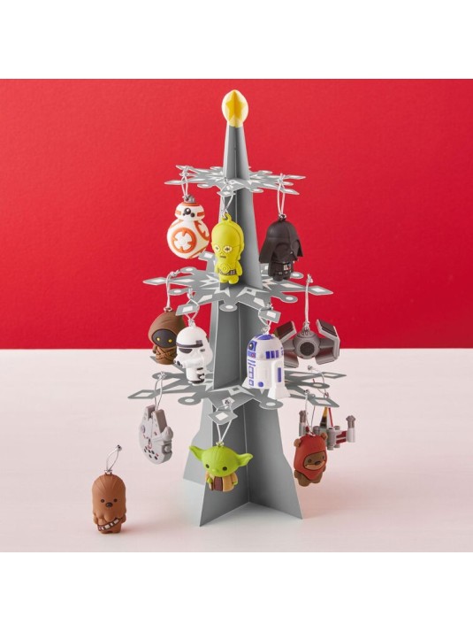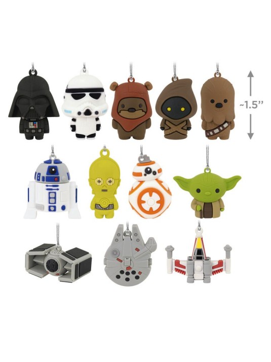Incorporate a little surprise into the 12 days leading up to Christmas with this fun Star Wars countdown calendar kit. The cardstock tabletop Christmas tree features spaces to hang twelve mini, shatterproof Christmas tree ornaments. Each of the included ornaments features a beloved Star Wars character or ship: Darth Vader, Stormtrooper, Wicket the Ewok, Jawa, Chewbacca, R2-D2, C-3PO, BB-8, Yoda, TIE Fighter, Millennium Falcon, and X-Wing. Some assembly required.