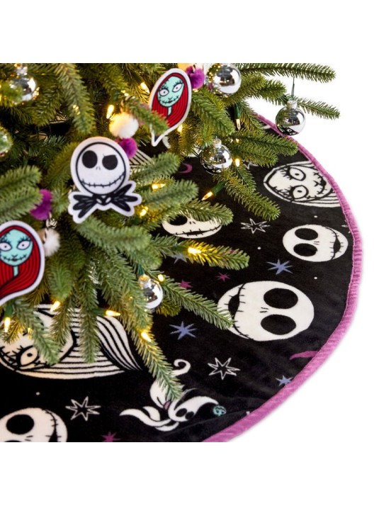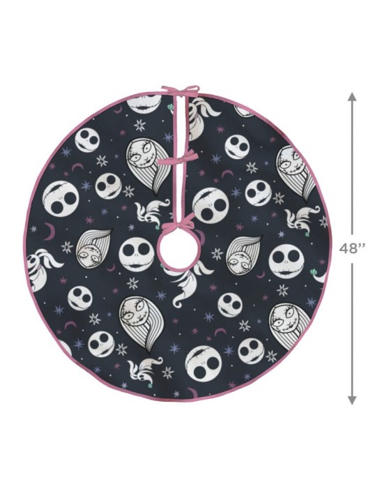 Scare up some holiday fun with this frightfully fun Disney Tim Burton's "The Nightmare Before Christmas" Christmas tree skirt. The printed plush accessory features a celestial design with the faces of Jack Skellington, his stitched-up sweetheart Sally and Zero the dog, finished with dusty rose edges and ties.