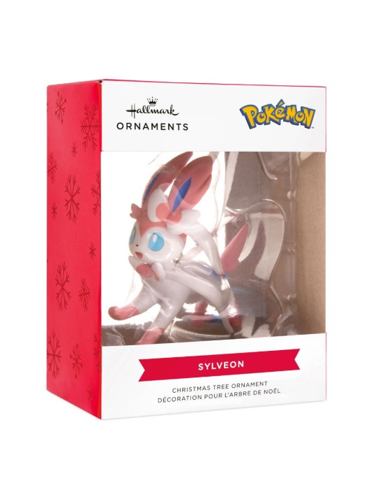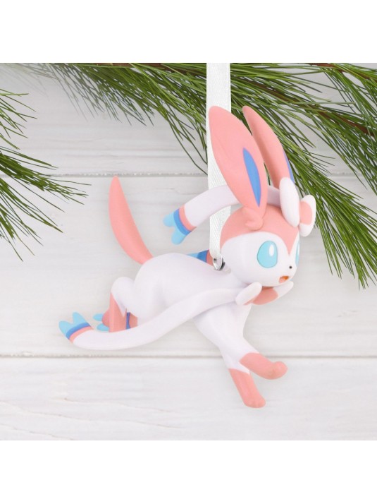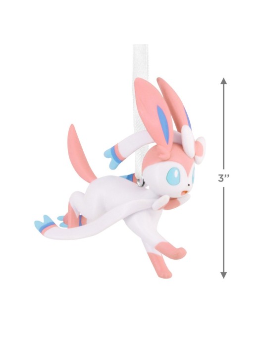 Acknowledge and appreciate the aura of peace emanating from Sylveon with this Christmas tree ornament of the beloved Pokémon who evolves from Eevee and is known for soothing opponents and easing hostility. The fairy-type Pokémon features two bows with ribbon-like feelers, a pale ivory quadrupedal body, light blue eyes, pink feet and tail, and long pink ears with blue centers.