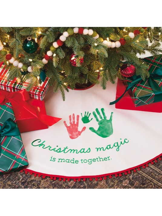 Create a one-of-a-kind keepsake gift you'll love to place under the tree every year with this cotton Christmas tree skirt handprint kit. This fun activity is perfect for the whole family to do together when you get ready to decorate for Christmas, and the festive skirt features red pom-pom trim and a green embroidered message that coordinate with the paint colors included in the kit. Use the nontoxic red and green paints to add the whole family's handprints, footprints, and paw prints to the tree skirt this year. Then you can add to the design every year or every few years to capture how your family grows.