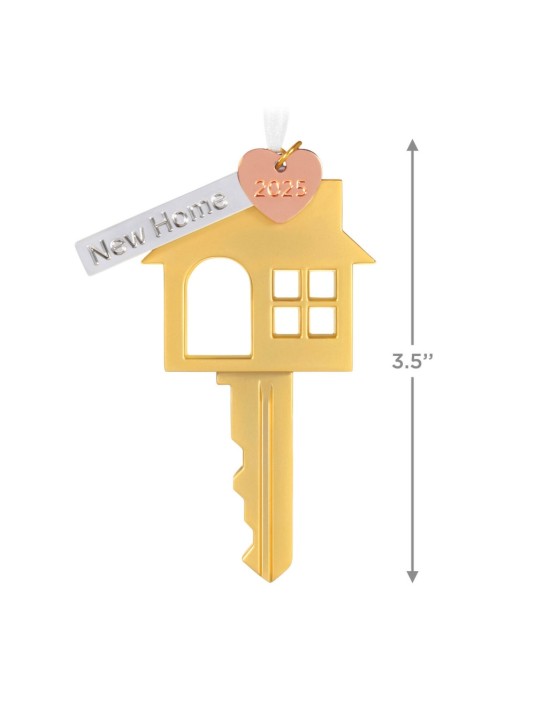 Enjoy your first holiday season in the cozy comforts of your new home. Celebrate with this charming metal Christmas tree ornament that will always remind you of that special first year in your new abode. The fun decoration featuring a gold key shaped like a house and accented with a heart and banner charm makes a great housewarming gift for first-time homeowners.