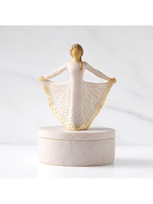 Standing figure in cream dress with hands to heart in empathetic gesture