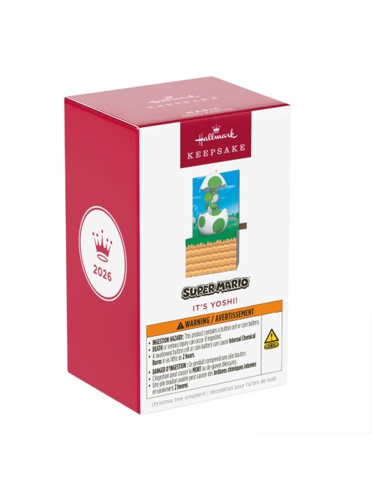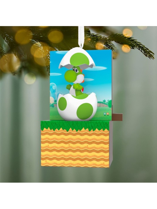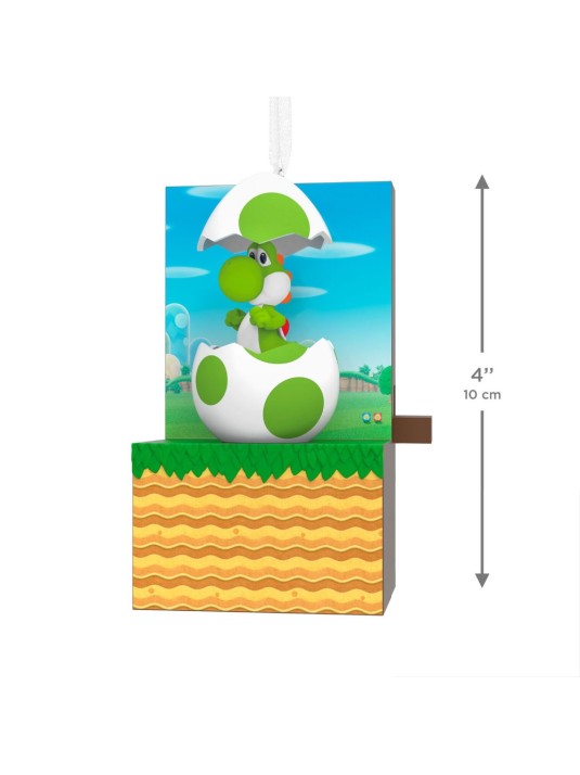 Power up the holiday fun with this playful Christmas tree ornament featuring Yoshi, Mario's sidekick from Nintendo's classic video game "Super Mario Bros." Press down on the lever to see the green and white dinosaur hatch from the egg and hear iconic sounds from the popular video game. Battery operated.