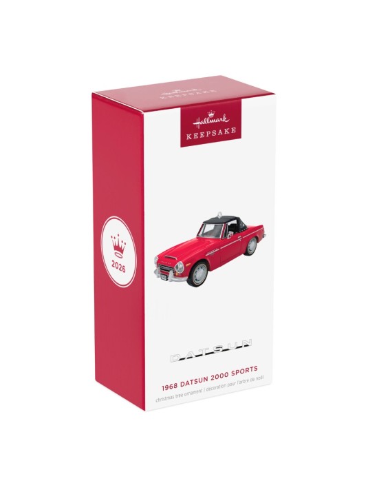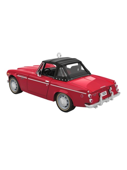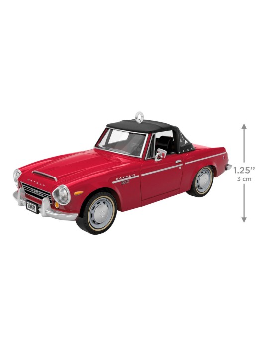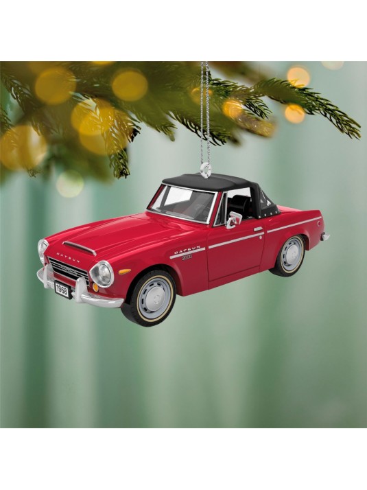 Cruise into the holidays in vintage style when you hang this Datsun 2000 Sports Christmas tree ornament. With a cherry red paint job and black convertible top, this die-cast metal car decoration features the iconic 1968 high-performance sports roadster with wheels that turn and year-dated license plates.