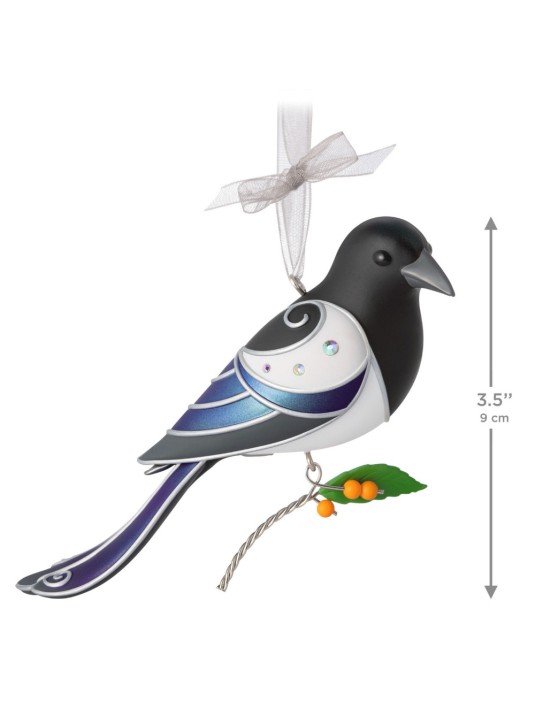 Add nature's splendor to your holiday celebrations with this pretty Black-Billed Magpie Christmas tree ornament. The charming black, blue and white feathered friend, featuring metallic silver embellishments, gem details and a dangling berry stem, is sure to delight bird enthusiasts.