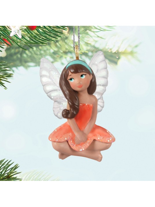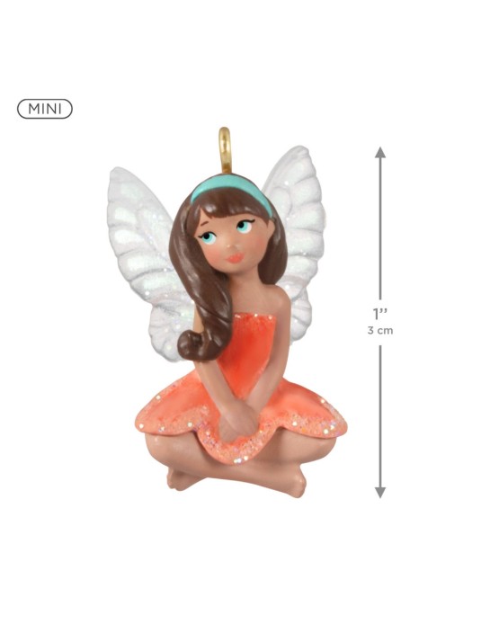 Make the holidays a little sweeter when you hang this cute miniature fairy Christmas tree ornament. The pretty brunette pixie is dressed in a petal-perfect pale orange dress with sparkling glitter accents and a soft blue headband that matches her eyes. A dusting of glitter on her wings adds shimmer to her demure pose. She makes the perfect addition to a mini tabletop tree or your Fairy Messengers Keepsake Ornament collection.