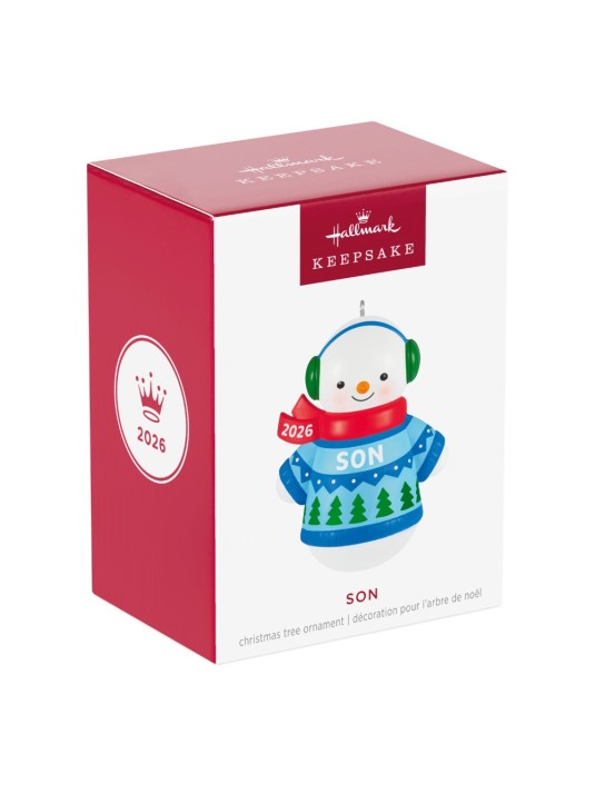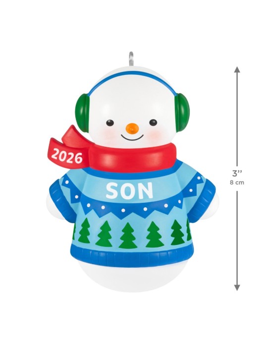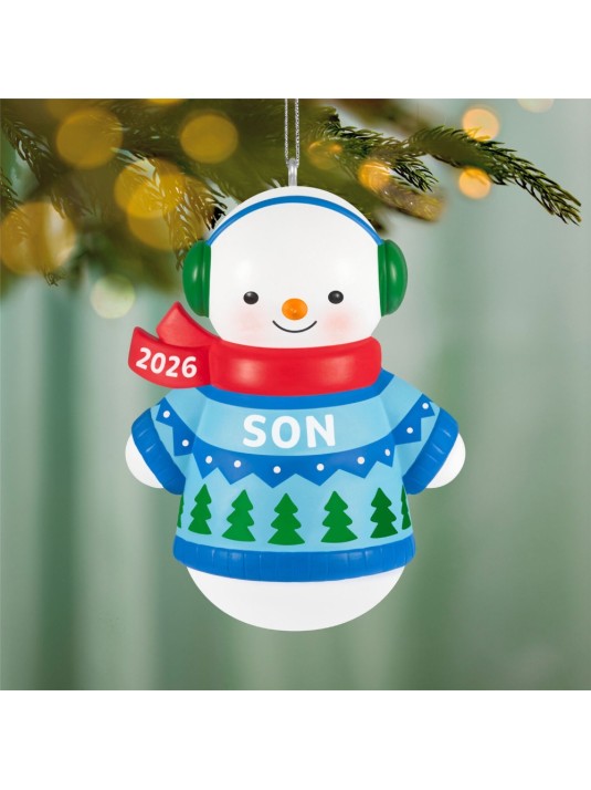 Melt hearts and celebrate family with this charming snowman Christmas tree ornament. The fun decoration in honor of a son features a smiling snow-boy dressed in a festive blue and green sweater and matching earmuffs with a red, year-dated scarf. Coordinating mom, dad and daughter ornaments (sold separately) will bring holiday cheer to your winter wonderland.