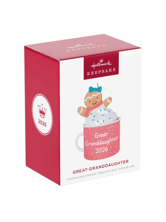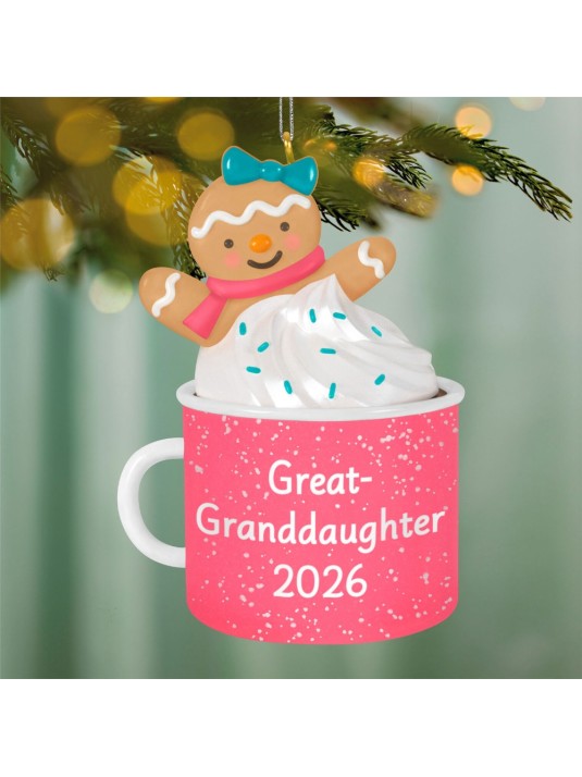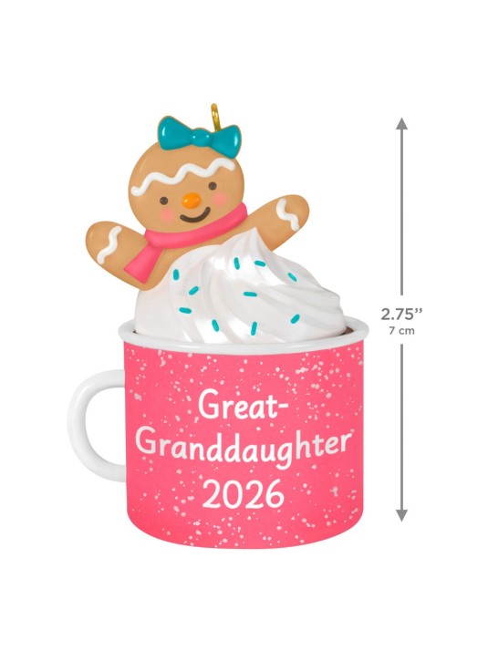 Sweeten the holidays for a special great-granddaughter with this whimsical Christmas tree ornament. The year-dated decoration features a pink- and white-speckled mug of hot chocolate topped with whipped cream and a smiling gingerbread girl cookie.