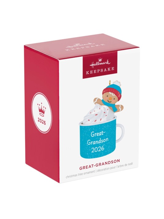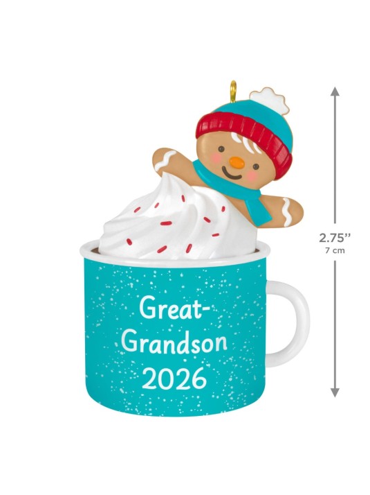 Sweeten the holidays for a special great-grandson with this whimsical Christmas tree ornament. The year-dated decoration features a teal blue- and white-speckled mug of hot chocolate topped with whipped cream and a smiling gingerbread boy cookie.