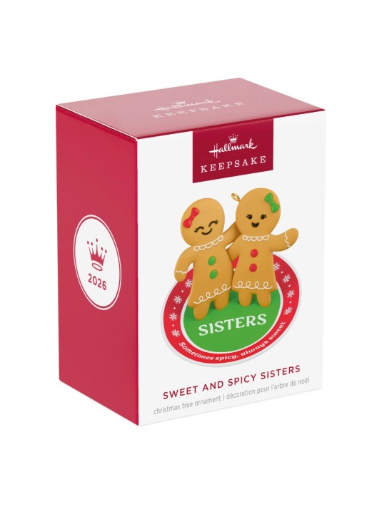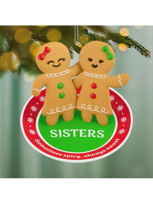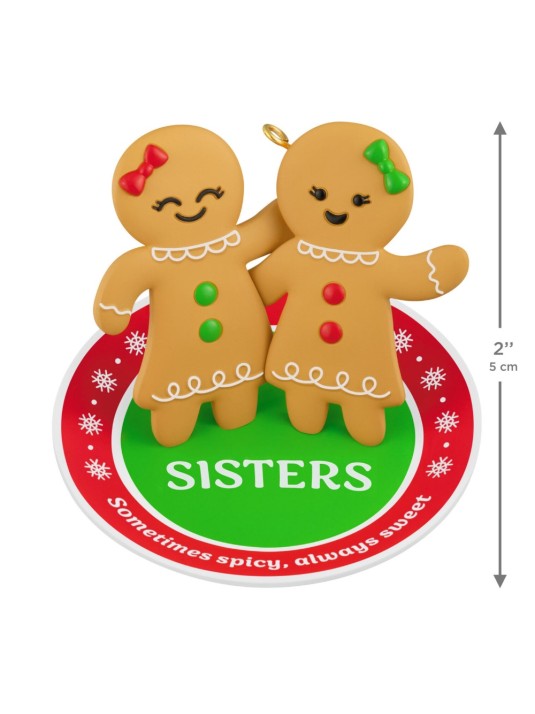 Celebrate the special bond (with all the ups and downs!) you have with your sister with this cute Christmas tree ornament. The sweet design features an adorable pair of gingerbread girls with red and green buttons and bows standing arm-in-arm on a festive rug with a fun-loving message.