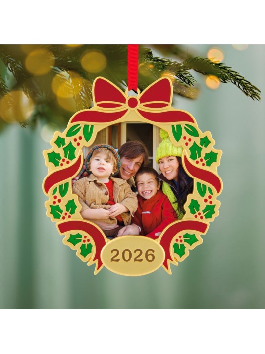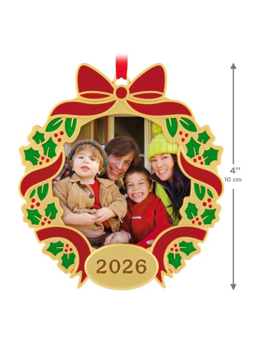Display a special moment or memory every holiday season with this year-dated photo holder Christmas tree ornament. The metal picture frame decoration features a pretty gold wreath decorated with green holly and red ribbon. Slip a favorite photo inside to relive a joyful moment again and again.