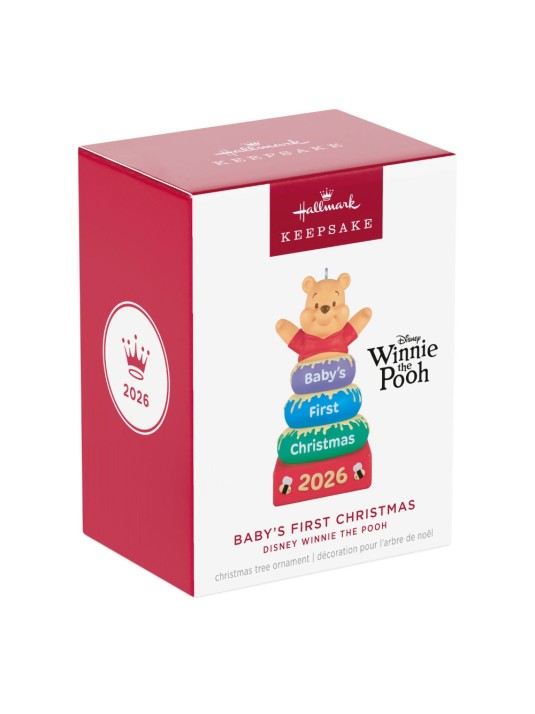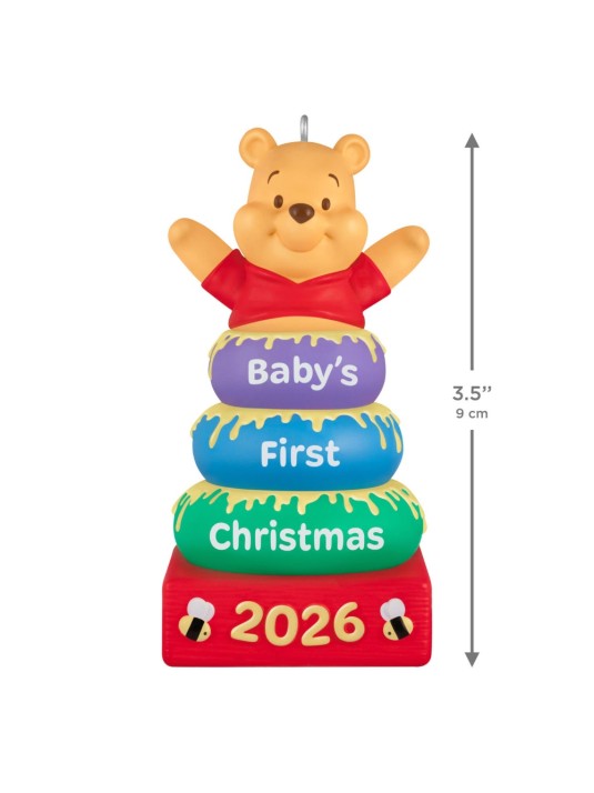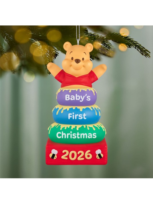 Celebrate a baby's first Christmas with Winnie the Pooh. This adorable Christmas tree ornament features Pooh bear at the top of a set of baby stacking rings. Sweet details like honey oozing out between the rings, cute honeybee designs and a commemorative, year-dated message make this cheerful ornament the perfect gift for remembering a baby or grandchild's very first holiday season.