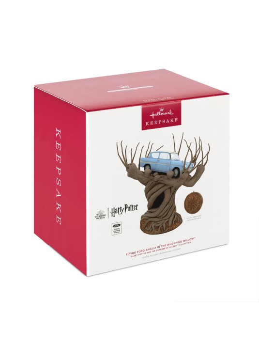 When Harry and Ron are surprisingly blocked from entering Platform Nine and Three-Quarters, they decide to "borrow" Mr. Weasley's Flying Ford Anglia to travel to Hogwarts. Relive the mystery and adventure that fills Harry Potter's second year at Hogwarts School of Witchcraft and Wizardry with this Christmas tree topper featuring the enchanted blue sedan trapped in the branches of a Whomping Willow tree. Plug it into the included power adapter for constant illumination, then press the button—either on the included Chamber of Secrets Door remote control or on the back of the tree topper—to start a sound and light scene from the movie. Connect one or more Harry Potter and the Chamber of Secrets Storytellers ornaments—Harry Potter, Dobby, Ron Weasley and Hermione Granger, Lucius and Draco Malfoy, and Hagrid (each sold separately)—to unlock additional exclusive performances that you can't access with the ornaments alone!