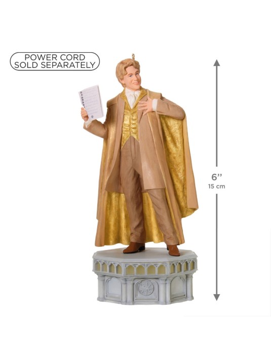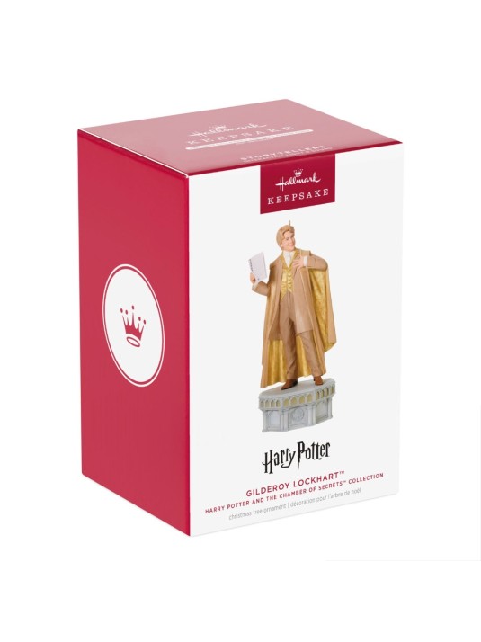 Relive the mystery and adventure that fills Harry Potter's second year at Hogwarts School of Witchcraft and Wizardry with this Christmas tree ornament. As the new professor of Defense Against the Dark Arts, the dubiously-famous Gilderoy Lockhart attempted to impress students with tales of heroism against dark creatures and to use his association with Harry Potter to bolster his own fame. Ultimately, Harry and Ron exposed his fraudulence and he fell from grace when his own memory-erasing charm backfired. Plug the ornament into Hallmark's Keepsake Power Cord (sold separately) for constant illumination, then press the button to start a light and sound scene from the movie. Connect all of the Harry Potter and the Chamber of Secrets Collection Storytellers ornaments — Harry Potter, Dobby, Ron Weasley and Hermione Granger, Lucius and Draco Malfoy, Hagrid, Gilderoy Lockhart and Albus Dumbledore — and the Flying Ford Anglia in the Whomping Willow Tree Topper (each sold separately) to unlock additional amazingly interactive performances.