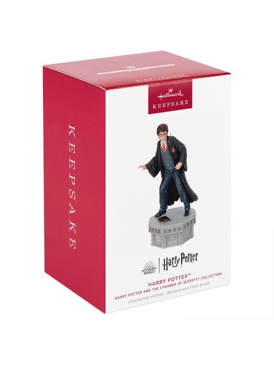 Relive the mystery and adventure that fills Harry Potter's second year at Hogwarts School of Witchcraft and Wizardry with this Christmas tree ornament. With the help of an enchanted diary, Harry finds his way into the recently-unlocked Chamber of Secrets, where he battles the heir of Slytherin—young Voldemort, Tom Riddle—and a poisonous Basilisk, to save Ginny Weasley and ultimately the students of Hogwarts. Plug this ornament, featuring a battle-weathered Harry, into Hallmark's Keepsake Power Cord (sold separately) for constant illumination, then press the button to start a light and sound scene from the movie. Connect all of the Harry Potter and the Chamber of Secrets Collection Storytellers ornaments—Harry Potter, Dobby, Ron Weasley and Hermione Granger, Lucius and Draco Malfoy, and Hagrid—and the Flying Ford Anglia in the Whomping Willow Tree Topper (each sold separately) to unlock additional amazingly interactive performances.
