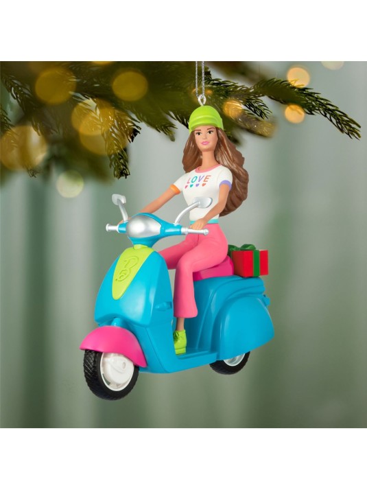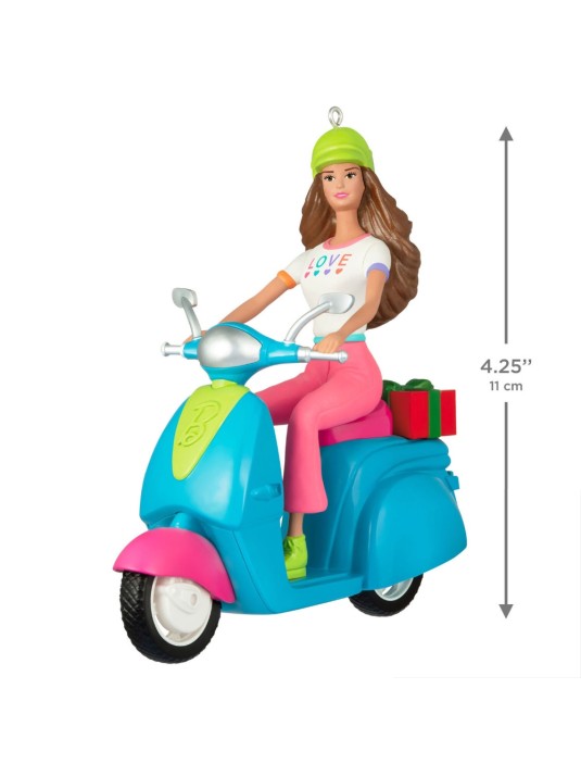 Cruise into a fashionable holiday season with this sporty Barbie Christmas tree ornament. Dolled up in a pastel "Love" tee and neon green helmet, Barbie is revved and ready to deliver a Christmas present on her stylish blue, green and pink scooter.