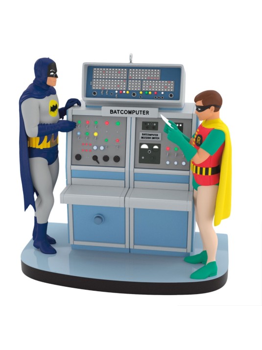 The Batcomputer was a vital piece of crimefighting equipment in the Batcave, a central hub for research, crime analysis and analyzing clues. Celebrate the 60th anniversary of the classic TV series "Batman" with this Christmas tree ornament featuring the retro-futuristic computing console that lights up and plays dialogue from the iconic episode when Batman and Robin discover they need to upgrade their "faithful friend" with a "dual-identity bat-sensor." Battery operated.