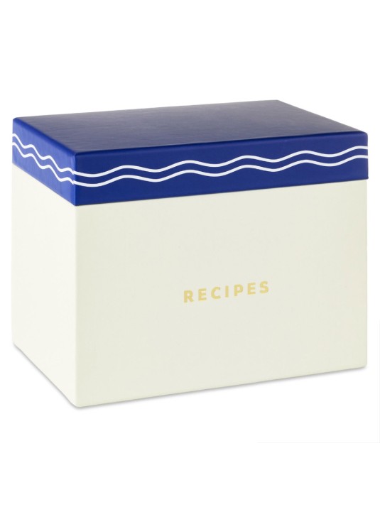 Store all your favorite recipes in this pretty recipe box decorated in a blue and white wavy stripe design. Paper-wrapped cardboard box with hinged lid is perfectly sized to hold 4x6 recipe cards. The box includes 36 coordinating recipe cards plus 12 tab dividers labeled by dish type — desserts, appetizers, drinks, breakfast & brunch, and more. Additional recipe cards are also available (sold separately). This stylish box makes a great gift for a bridal shower or housewarming party.