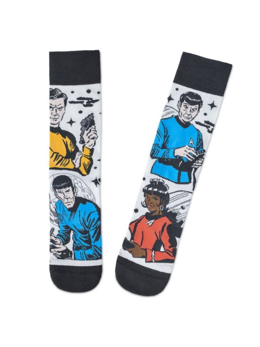 Keep the crew from the Star Trek "Enterprise" at your command with this pair of novelty crew socks featuring Captain Kirk, Lieutenant Uhura, Bones and Mr. Spock from the original TV series. These white socks with black accents showcase detailed stitched illustrations of the iconic characters, bringing a touch of sci-fi nostalgia to your everyday wear. The crew socks provide all-day comfort whether you're boldly going to work, relaxing at home or attending your next fan convention. A must-have for fans and collectors alike, these socks make a fun and functional gift for any Starfleet enthusiast.