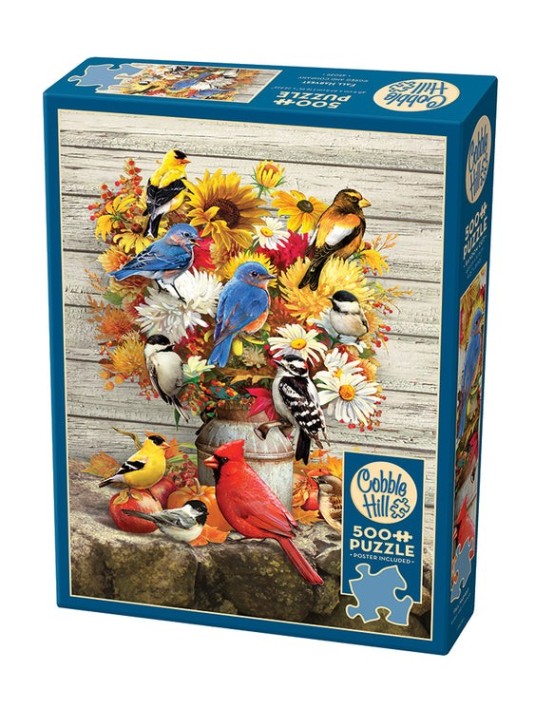 The Fall Harvest bouquet is a bountiful 500 piece autumn puzzle featuring fall florals and a bevy of birds.