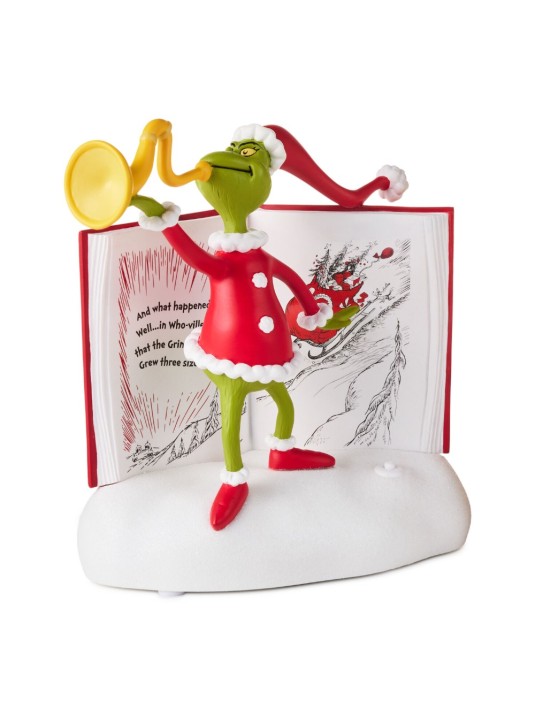 Celebrate the heartwarming magic of Dr. Seuss with this storybook Grinch figurine. Standing proudly before an open book displaying the moment when his heart grows three sizes, the Grinch wears his handmade Santy Claus hat and coat and holds a Who-ville horn to his lips. Crafted with charming detail, this Christmas figurine captures the spirit of redemption and joy from the classic holiday story "How the Grinch Stole Christmas!" Press the button on the snowy base to hear narration from the final pages of the book. This statue makes a must-have for fans of the classic tale and brings holiday cheer to any shelf, table or mantel.