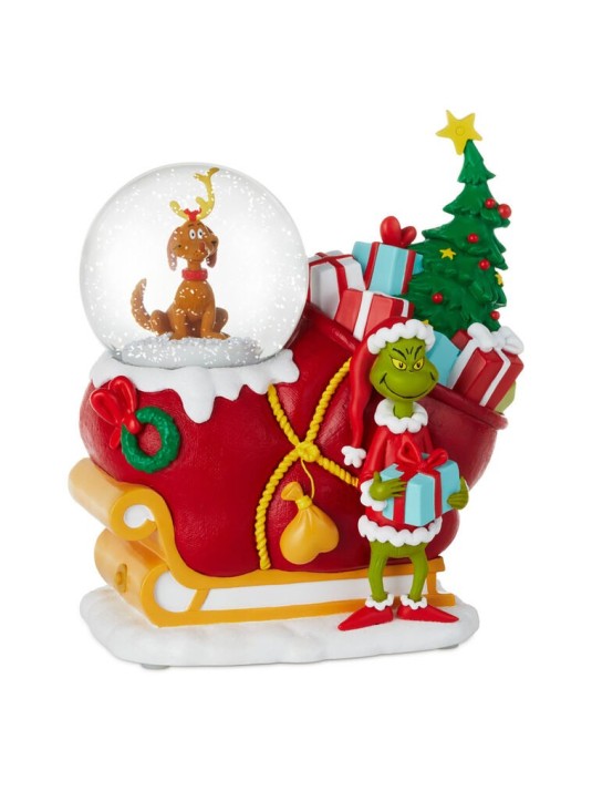 Bring whimsical holiday mischief to your Christmas decor with this delightfully devious Grinch figurine. Standing proudly before his overflowing sleigh packed with Who-ville toys, gifts, and festive trees, the Grinch is captured mid-caper wearing his Santy Claus coat and hat. Atop the sleigh, Max sits cheerfully inside a snow globe with a single antler tied to his head. Press the button on the front of the sleigh to watch snow swirl magically around Max while a charming rendition of “Up on the Housetop” fills the air. This enchanting piece with sound and motion makes a perfect centerpiece for any holiday Grinch collection or a joyful gift for fans of Dr. Seuss.