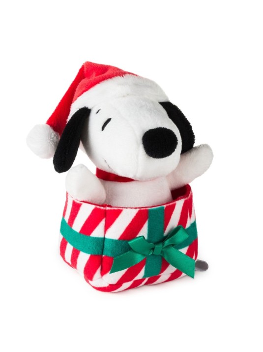 Unwrap the holiday fun with this adorable Snoopy zip-along toy. Stuffed pull-string toy features Snoopy in a Santa hat sitting inside a wrapped Christmas present. The plush beagle is ready for his holiday zoomies — so pull the string and watch the Peanuts pup zip playfully across the room. Small and cuddly, this Snoopy toy is perfectly sized for little hands.