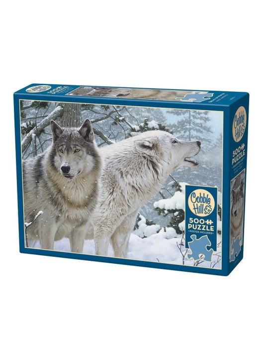 In the chill of the night, the "Breath of Winter" is exhaled from two winter white wolves seeking solace in the snowy trees. A 500 piece wildlife puzzle by Rod Lawrence.