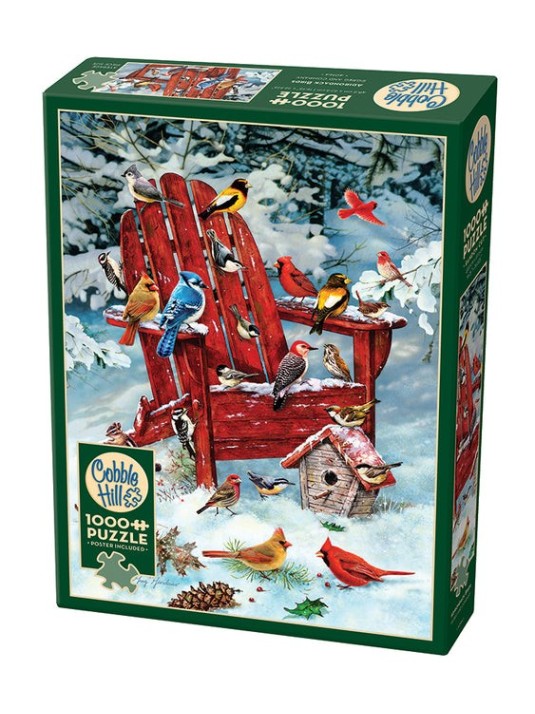 Adirondack Birds is a 1000 piece puzzle featuring a variety of birds gathered around the focal point of a red Adirondack chair. The frame of the puzzle is filled with snow and the bottom third of the puzzle is snow covered ground with several birds standing next to a pinecone and a little bird house with a red roof. There are many birds from woodpeckers, Blue Jay, cardinals, and orioles.