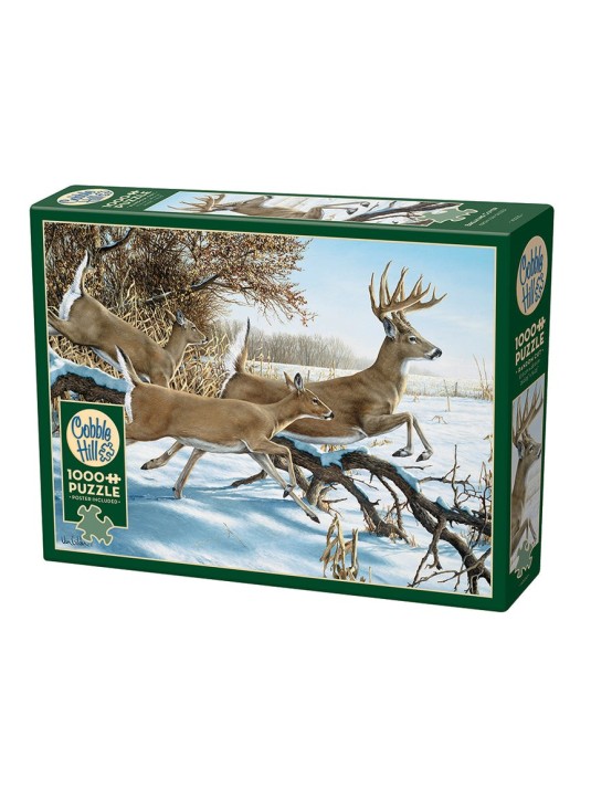 The white tailed deer are Breaking Cover as they hear the crackling of tree branches behind them. It's a tough call to run out into the open field, but they have to escape the snow covered forest before they become someone's prize for the winter. A heart pumping 1000 piece scenic wildlife puzzle.