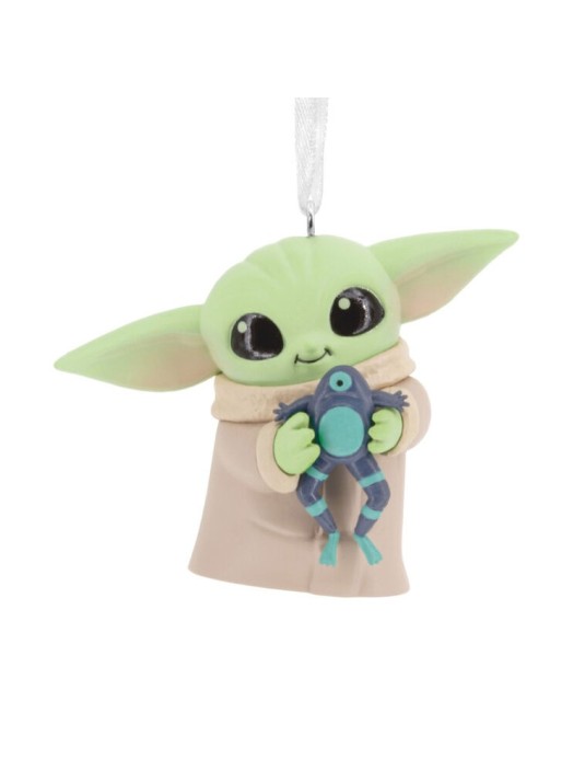Add some galactic cuteness to your holiday decorating when you display this Christmas tree ornament of Grogu from Star Wars: The Mandalorian. The fun decoration features a stylized design of the foundling holding his favorite snack, a frog.