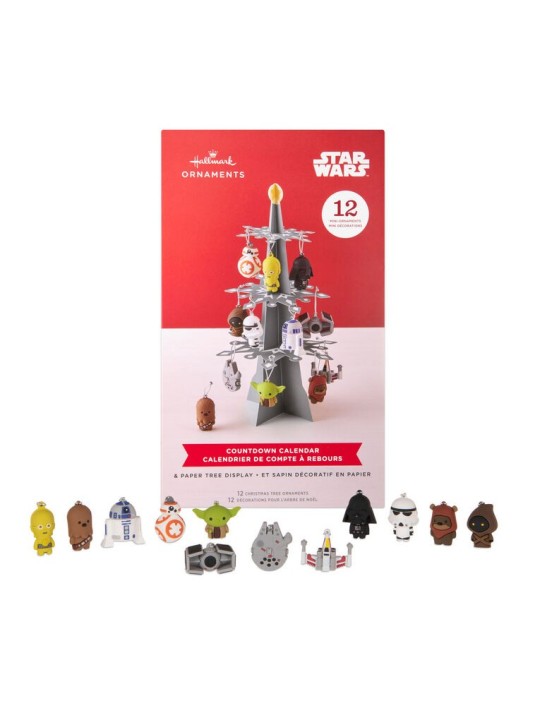 Incorporate a little surprise into the 12 days leading up to Christmas with this fun Star Wars countdown calendar kit. The cardstock tabletop Christmas tree features spaces to hang twelve mini, shatterproof Christmas tree ornaments. Each of the included ornaments features a beloved Star Wars character or ship: Darth Vader, Stormtrooper, Wicket the Ewok, Jawa, Chewbacca, R2-D2, C-3PO, BB-8, Yoda, TIE Fighter, Millennium Falcon, and X-Wing. Some assembly required.