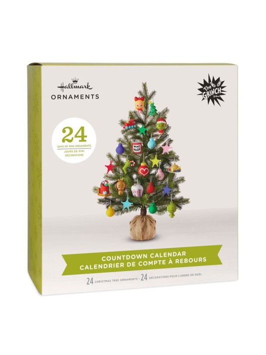 Count: 24 miniature Hallmark Christmas tree ornaments packaged in a countdown calendar box.