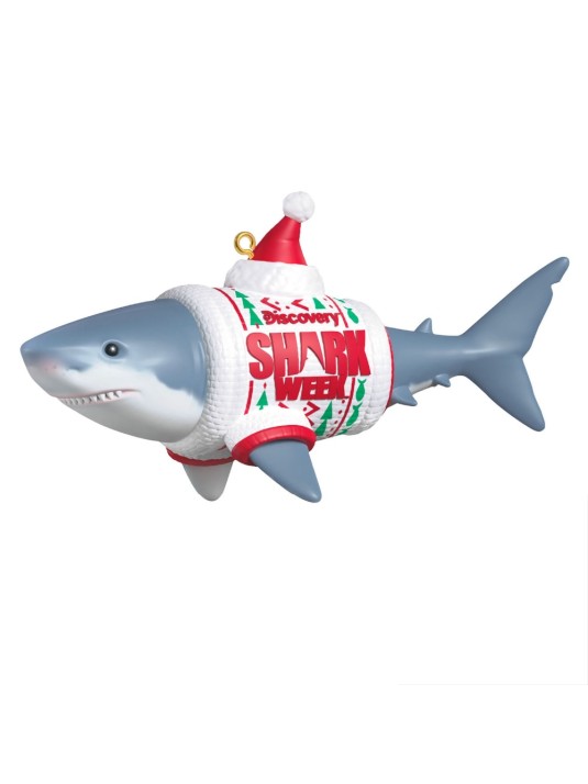 Make a spirited splash in your holiday decor with this playful Christmas tree ornament inspired by the longest running programming event in cable television history. Wearing an ugly Christmas sweater bearing the Discovery event's logo and a Santa hat, this great white shark adds some festive fun to the electrifying and unforgettable experience of Shark Week.