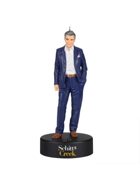 Celebrate the father figure we all adore as he navigates his family through a new town and a new lifestyle — of the broke variety — with this Johnny Rose Christmas tree ornament. The "Schitt's Creek" dad with highbrow taste and eyebrows for miles poses casually in his navy blue suit with jaunty pocket square and a put-upon expression. Press the button to play memorable quotes from the beloved TV show and hear his words of wisdom and placation. Battery operated.