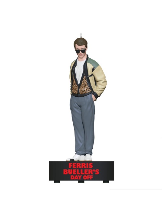 If Ferris Bueller taught us anything, it's that life moves pretty fast! So fans of the quintessential 80s coming-of-age movie "Ferris Bueller's Day Off" won't want to miss adding this Christmas tree ornament to their collection. The playful decoration features the charismatic, self-assured Chicagoland teenager stylishly posed in his iconic animal-print vest, bomber jacket and dark sunglasses. Press the button to hear him dish out some of his philosophical advice from the movie. Battery operated.