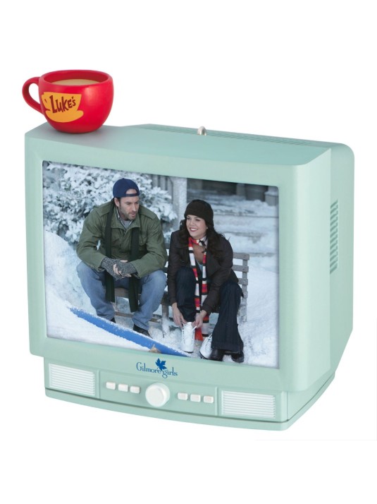 Relive the memorable moments of friendship and romance between Lorelai and Luke with this charming Christmas tree ornament. The fun "Gilmore Girls" decoration features a throwback TV set design with a red Luke's Diner latte mug perched on top and displays alternating lenticular images when tilted. Press the button to light the television screen and play audio clips from the show. Battery operated.