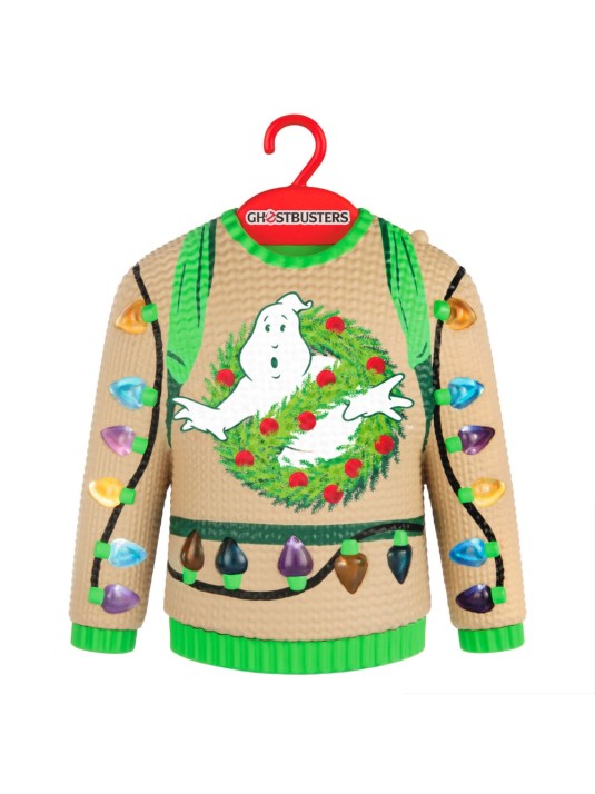 "Full neutronas!" Get a blast from the past — into the paranormal — with this whimsical Christmas tree ornament. Paying tribute to the 1980s supernatural comedy movie "Ghostbusters," the fun decoration features an ugly Christmas sweater decorated with a proton pack, a festive wreath version of the iconic movie logo and colorful light strings. Press the button to see the sweater light up and hear sounds from the proton pack and neutrona wand. Battery operated.