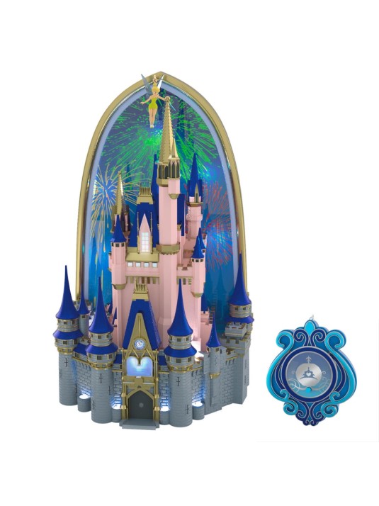 Relive the wonder of "The Most Magical Place on Earth" with this enchanting Christmas tree topper of the iconic Cinderella Castle. Press the button on the coordinating remote to experience one of three performances featuring synchronized sound and light, all inspired by a day at the Magic Kingdom: Walt Disney dialogue with "When You Wish Upon a Star” music and fireworks sounds, "Electrical Parade" music, and "We Wish You a Merry Christmas" music. A beautiful constant light show lends a festive glow all season long. Power adapter and remote control included.