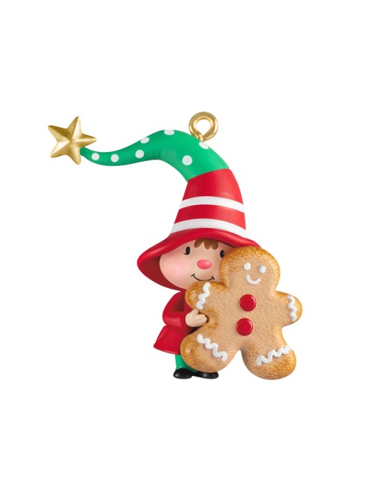 Clove, friend to a pair of cute gnomes named Gnaughty and Gnice, has a special treat to add to your Gnome for Christmas Keepsake ornament series collection. This cute Christmas tree ornament features the little girl gnome in a festive red and green hat topped with a shiny gold star holding her favorite holiday treat, a gingerbread man cookie.