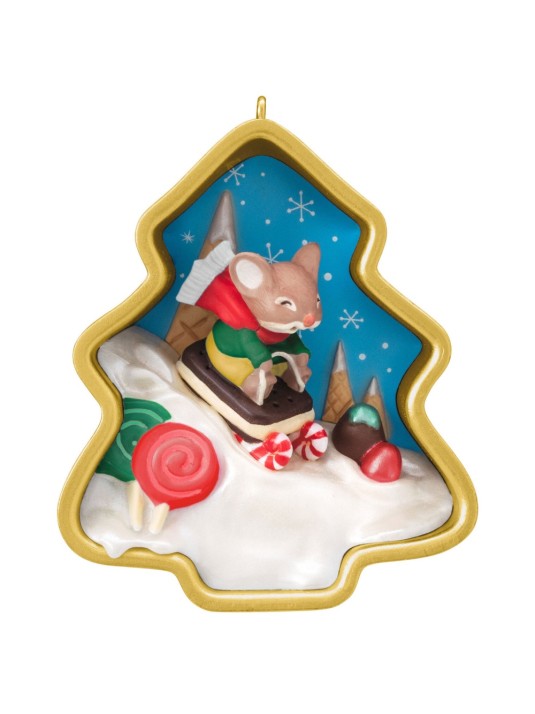 For 15 years, fans of the adorable Cookie Cutter Keepsake Ornament series have delighted in diorama scenes of a cute mouse enjoying a variety of holiday activities framed within a fun cookie cutter. This special edition repainted version of the first design in 2012 features the little friend sledding down a frosting-snow hill accented with candy trees within a Christmas tree-shaped cookie cutter.