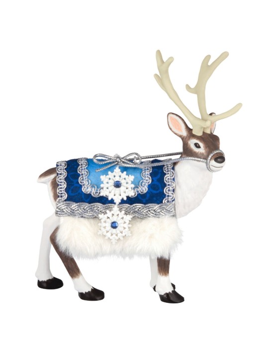 Welcome the wonder of the season with this handsome Christmas tree ornament. The regal reindeer is dressed with a brilliant blue fabric saddle blanket trimmed with faux fur and metallic silver braided trim, and adorned with sparkling snowflakes.