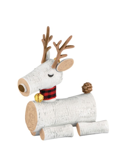 Trot into the season with this festive reindeer Christmas tree ornament that looks like it's constructed from birch wood logs. With a red- and black-checkered scarf and gold bell around its neck and a pine cone tail, this whimsical woodsy friend is sure to put smiles on the faces of all who see it.