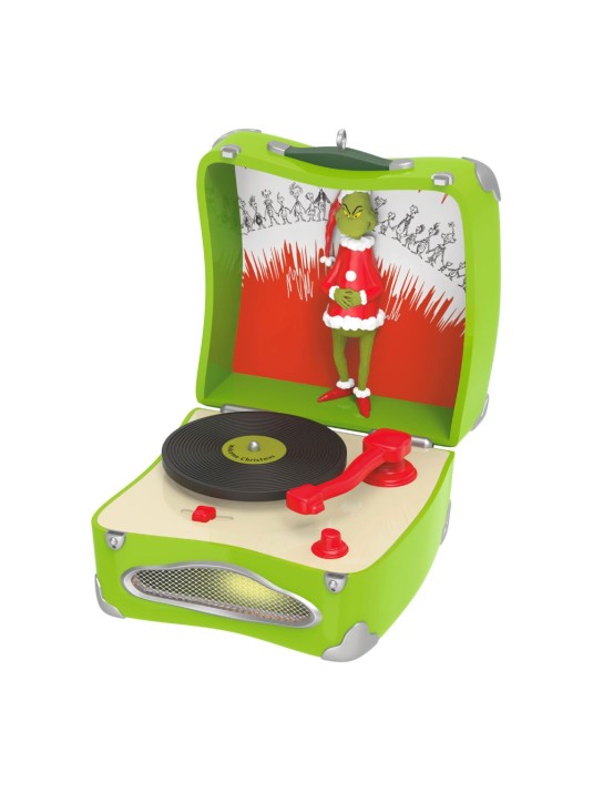Dressed in a Santa disguise and bearing a heart two sizes too small, Grinch thought he could eliminate Christmas by stealing the decorations and presents from Whoville in the Dr. Seuss classic "How the Grinch Stole Christmas!" But when his attitude softened and his heart grew, he joined the Who's in all the celebrations. Relive the timeless story with this Christmas tree ornament. The green, vintage-inspired record player lights up and plays "Welcome Christmas" when you move the arm over the record. Battery operated.