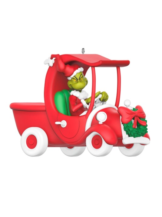 Delight all the Whos in your home, the tall and the small, with this fun Christmas tree ornament of Grinch wearing his homemade Santa suit and driving a festive red truck adorned with a Christmas wreath on the front. Makes a perfect addition to a collection of decorations celebrating the Dr. Seuss classic "How the Grinch Stole Christmas!"