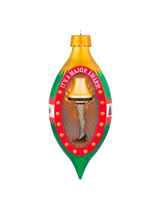 Make Old Man Parker's "major award" the shining glory of the tree this year! This indescribably beautiful Christmas tree ornament features his beloved leg lamp showcased on a vintage-style finial ornament and accented with more iconic images from the hit holiday movie "A Christmas Story." Insert the bulb of a standard miniature light string through the rubber grommet on the ornament to create a special lighting effect.