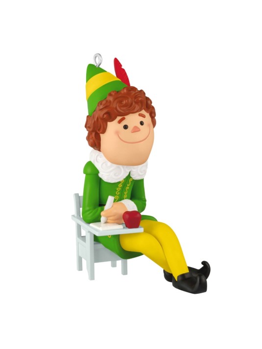 Despite his human stature, Buddy the Elf is always eager to learn and try to be just like all the other elves at the North Pole. Santa's oversized helper isn't discouraged by his too-small-for-him school desk in this fun Christmas tree ornament inspired by the humorous scene in the classic holiday movie "Elf."