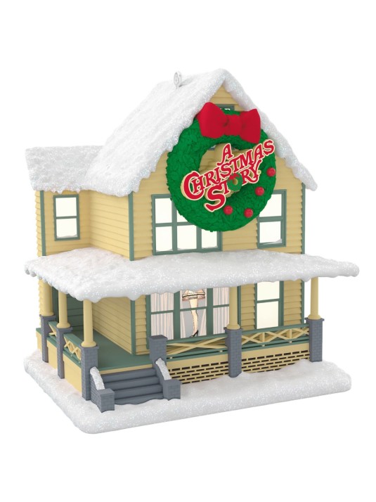 Relive the family drama and day-to-day hilarity as narrated by Ralphie Parker when you add this Christmas tree ornament to your holiday display. With glittery snow-capped roofs and a festive wreath hanging prominently on the front, the house on Cleveland Street set the scene for the infamous leg lamp incident and other holiday happenings in the hit movie "A Christmas Story." Insert the bulb of a standard miniature light string through the rubber grommet on the ornament to create a special lighting effect.
